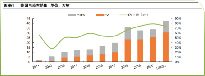 美国的电动车销量在过去几年中实现了显著增长。2020年美国电动车销量为33.2万辆,而到2021年仅前九个月就达到了42万辆,同比增长超过一倍。预计 2030 年美国电动车销量达到 900 万辆。在政策的支持和供给周期的推动下,预计 21 年美国新能源汽车销量达到 66 万辆,同比翻倍,渗透率 4%;2025 年新能源汽车销量 354 万辆,渗透率20%;2030年新能源汽车销量900万辆,实现 50%的中期渗透率目标,2020-2030 年十年复合增速 39%,美国将成为全球新能源汽车新的增长动能。